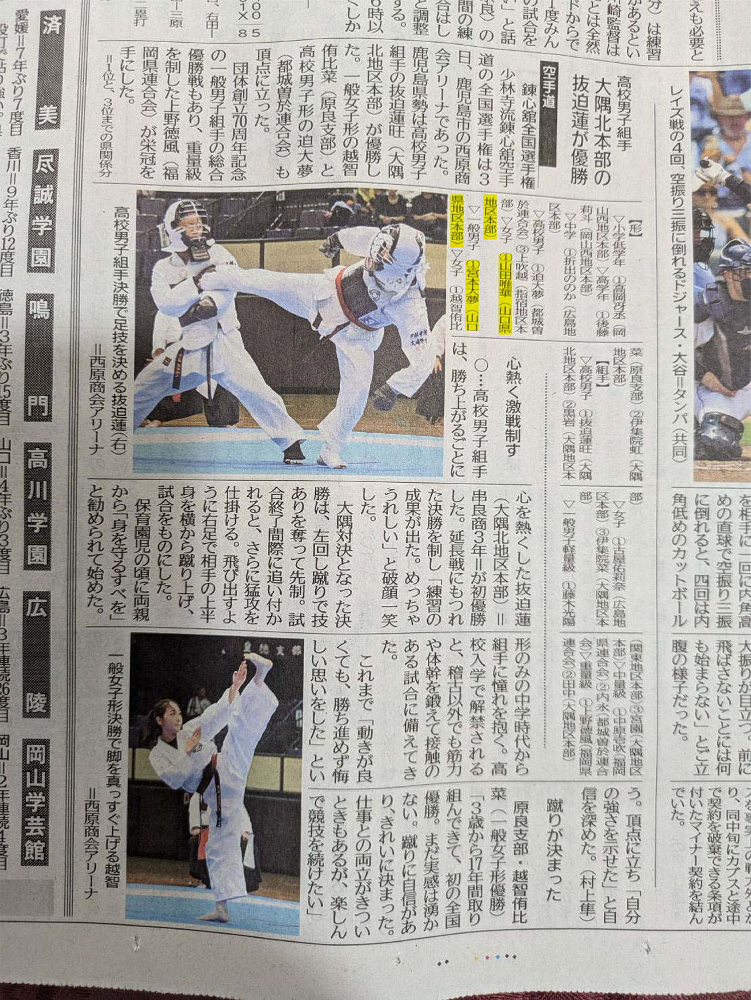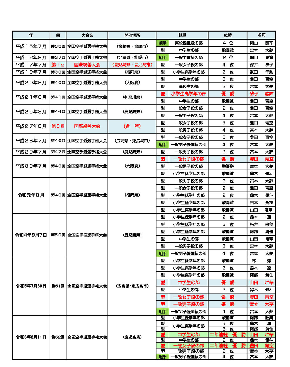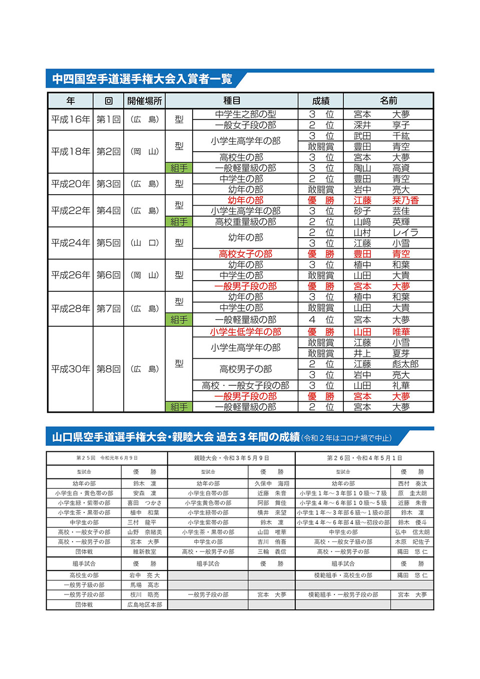山口県地区本部・国際・全国空手道選手権大会入賞者一覧