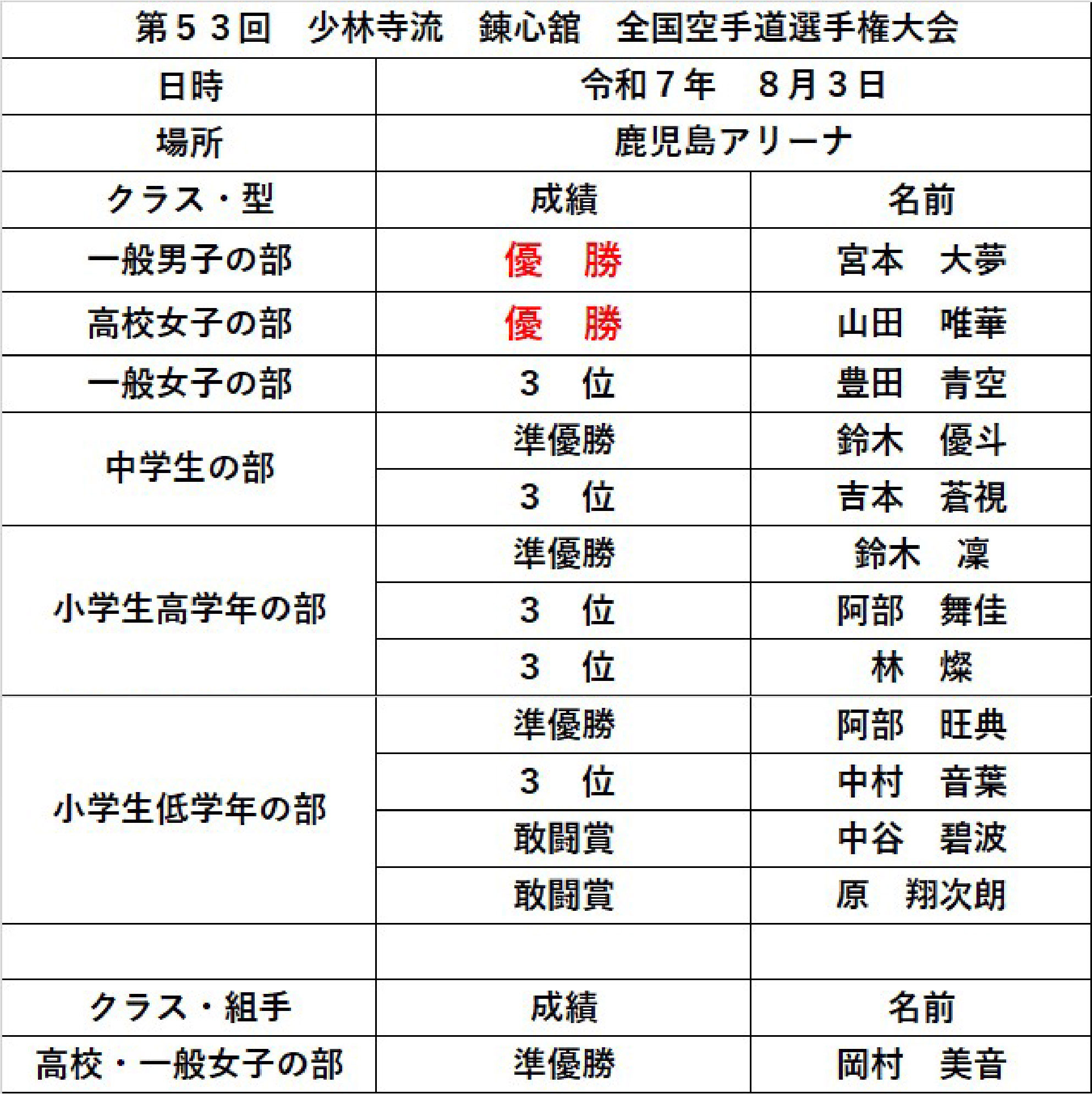 第53回 少林寺流 錬心舘 全国空手道選手権大会 結果